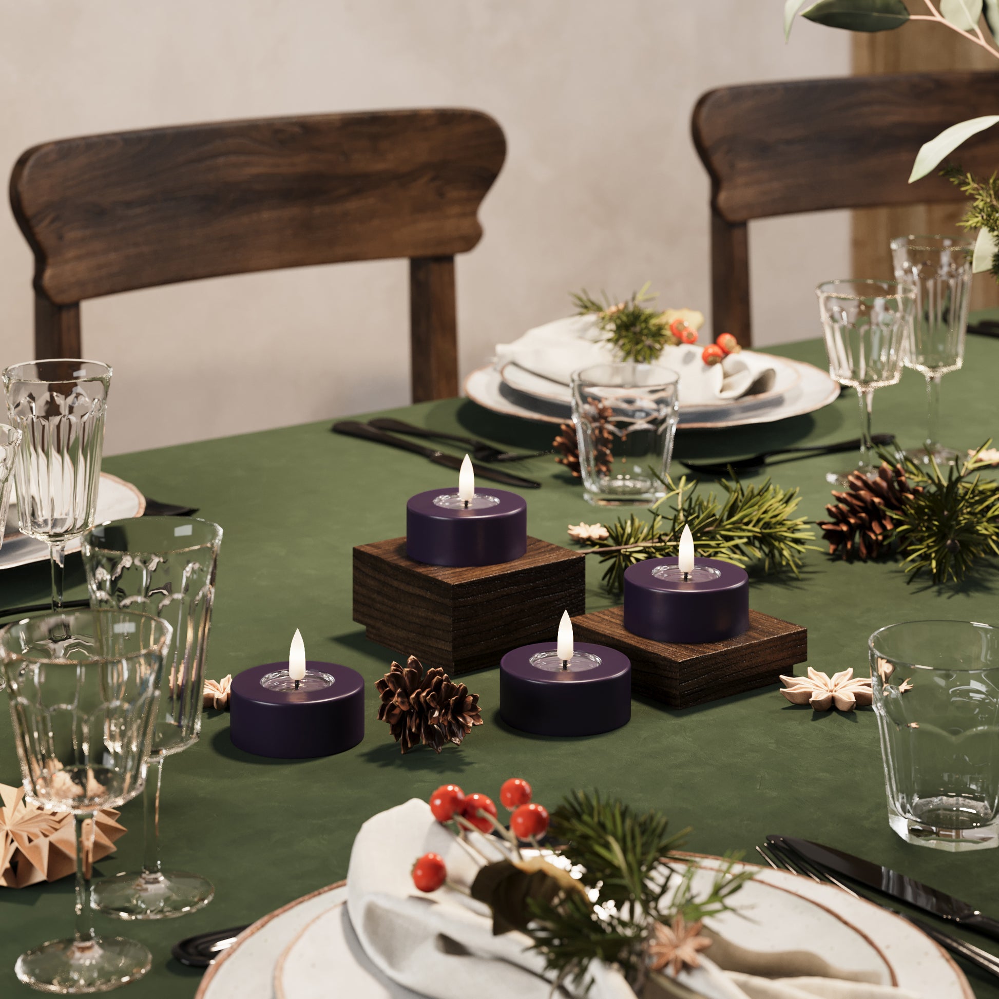 Pakke med LED jumbo fyrfadslys i farven Mørkelilla i flere størrelser.
