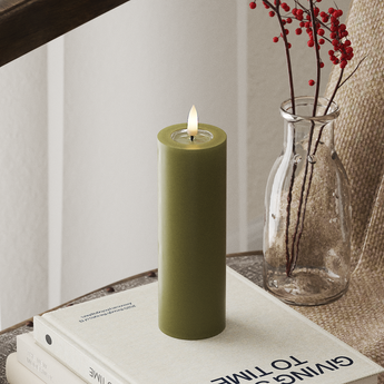 Αυτό το κομψό φως LED μπλοκ στο Ελαιόχρωμο Προσφέρει ένα πραγματικό αποτέλεσμα «πραγματικής φλόγας» που είναι τόσο ζωντανό όσο ένα πραγματικό κερί. Με ύψος 15 cm και διάμετρο 5 cm, κάθε φως LED μπλοκ είναι προσεκτικά κατασκευασμένο από κεριά και ρητίνη, εξοπλισμένη με μια ζωντανή 3D φλόγα και μια μοναδική επίστρωση ρητίνης στην κορυφή. Αυτός ο συγκεκριμένος συνδυασμός όχι μόνο δημιουργεί ένα αυθεντικό συναίσθημα, αλλά και δίνει το χαρακτηριστικό «υγρό βλέμμα» που μιμείται τα λιωμένα κεριά τέλεια.