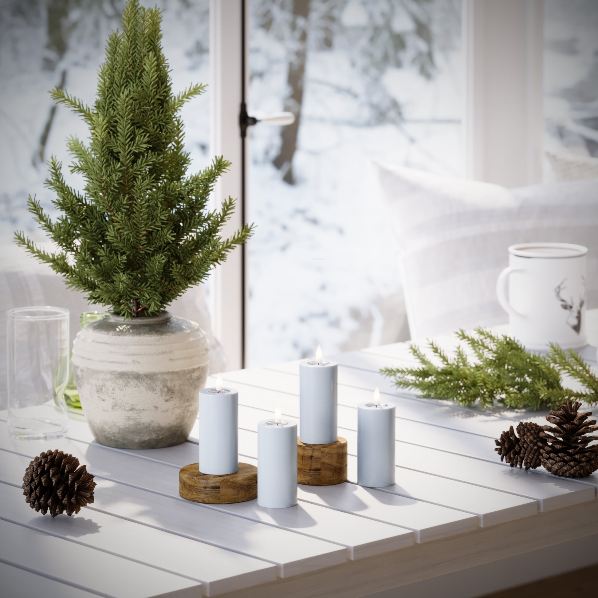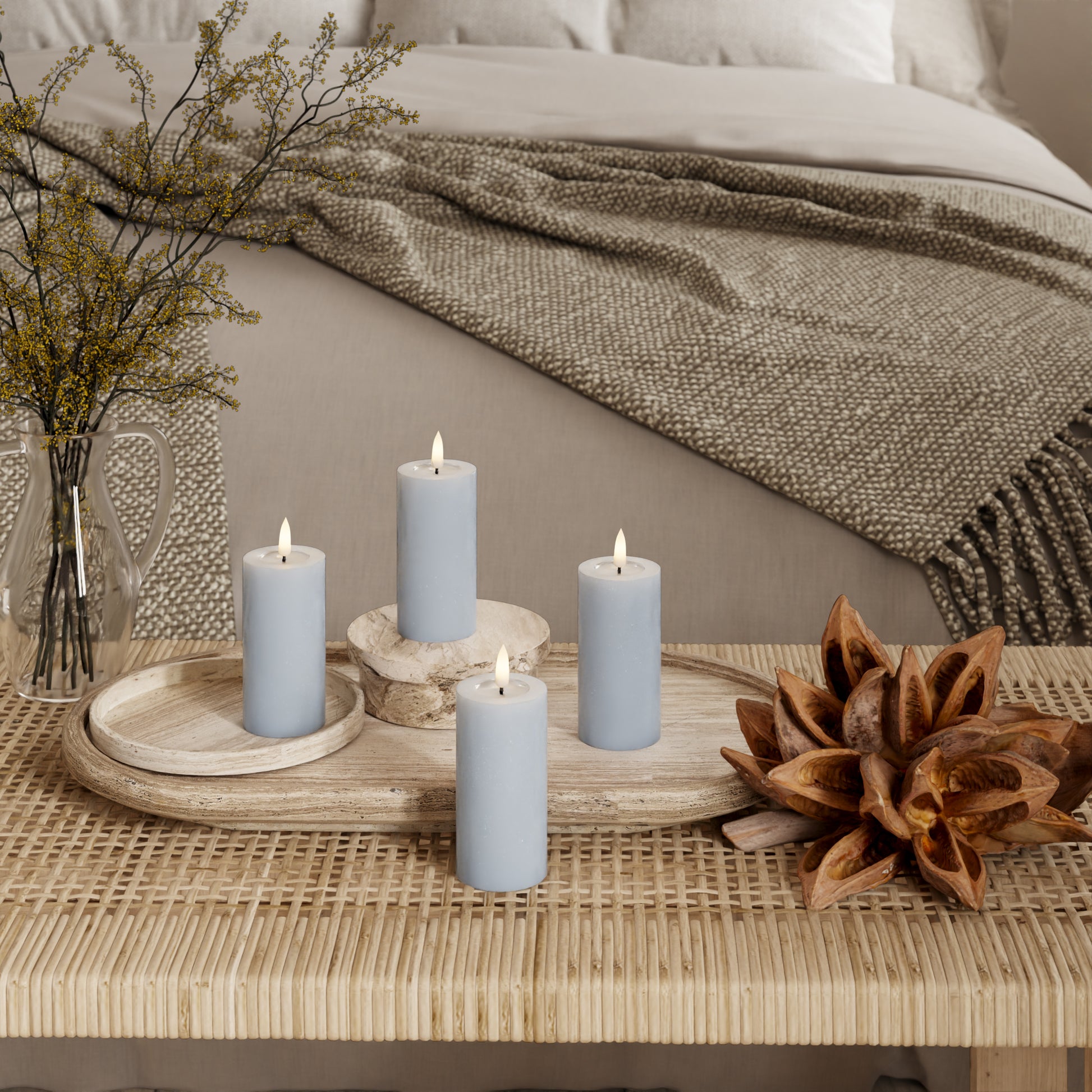 Brug bloklys i små grupper med forskellige højder. Det giver dybde og et gennemført udtryk i indretningen.