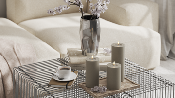 For et roligt helhedsindtryk kan du samle lysene på et fad og variere højderne, mens farverne holdes i samme palette.